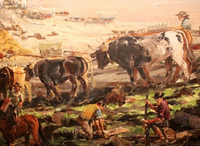 There is a Hidden Mickey in this pic of the "Westward Ho!" painting by Jack Mart Smith taken inside of the United States Pavillion in Epcot....