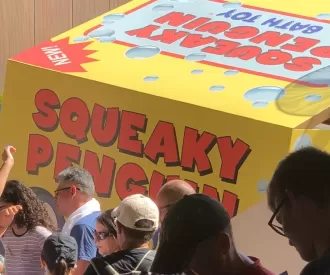 VIEW HIDDEN MICKEYThere is a Hidden Mickey on the Squeaky Penguin box that can be seen on the waiting line for Slinky Dog Dash ride.