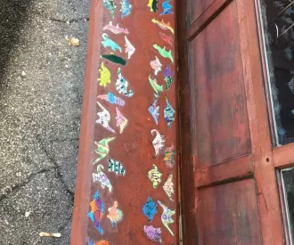 There are two Hidden Mickeys on this bench that can be seen in the Asia area of Animal Kingdom. One is a drawing...